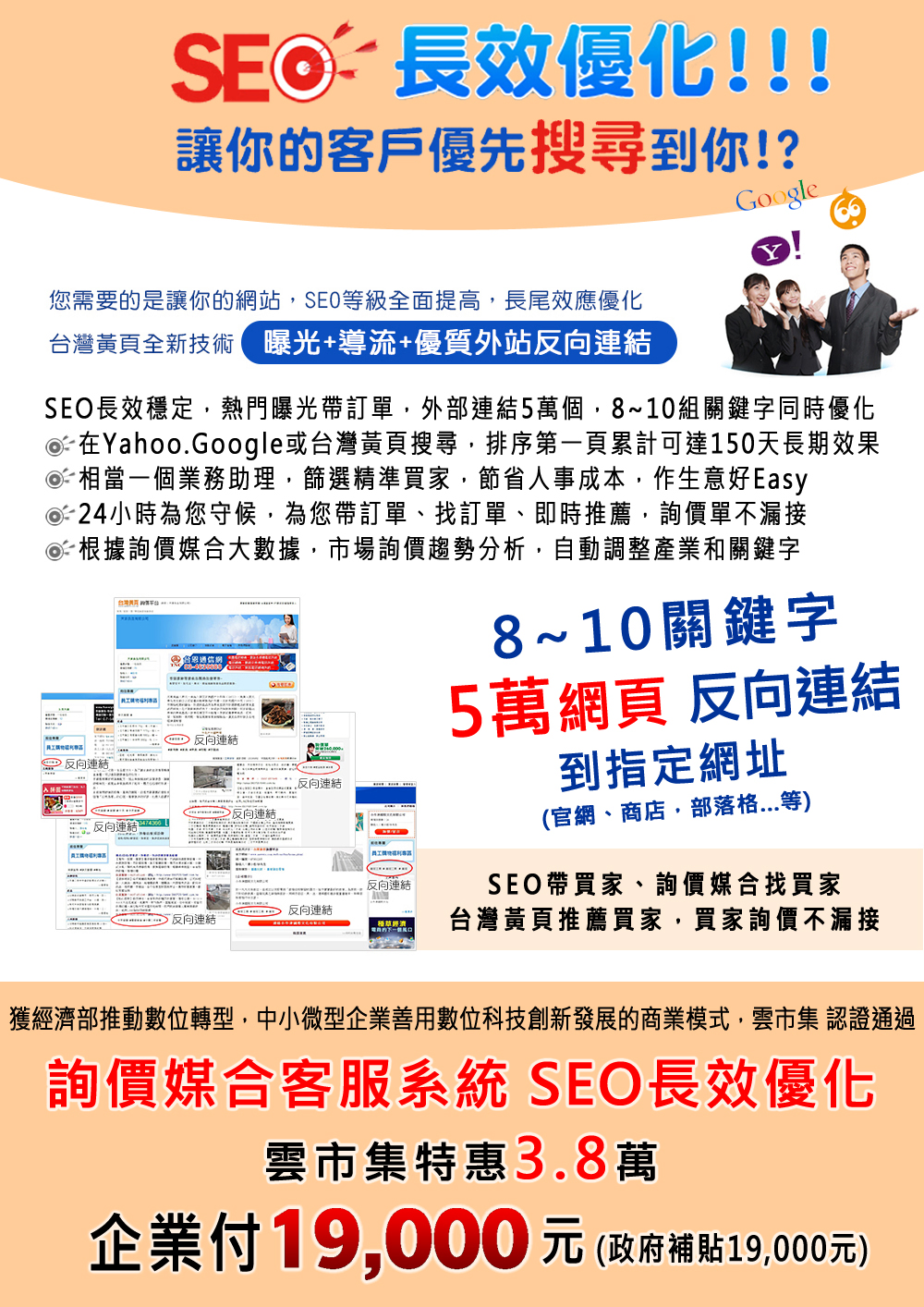 1.可設定相關產業,8~10組詢價關鍵字及營業項目 2.協助建置優質網站外部連結,SEO同時優化、排名 3.SEO帶買家、詢價媒合找買家、台灣黃頁推薦買家,雲端客服,買家詢價不漏接